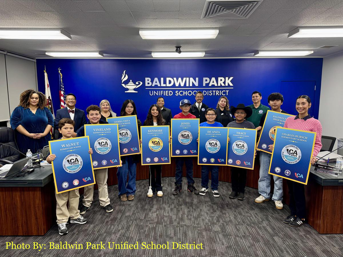 Baldwin Park Unified School District’s six Platinum Award recipients included Charles Bursch Elementary School, De Anza Elementary School, Sierra Vista Middle School, Tracy Elementary School, Vineland Elementary School, and Walnut Elementary School.