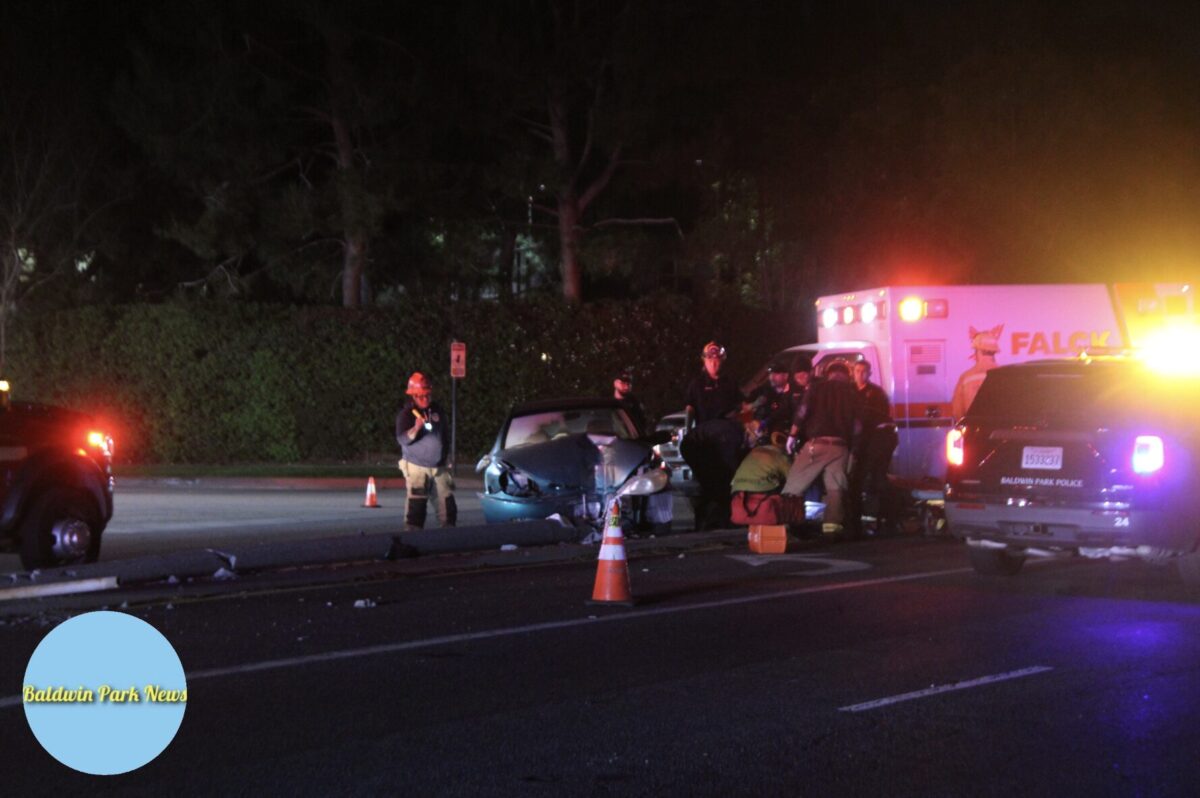 Una persona resultó herida el sábado por la noche después de que un vehículo se estrellara contra un poste de luz propiedad de la ciudad en Baldwin Park.
